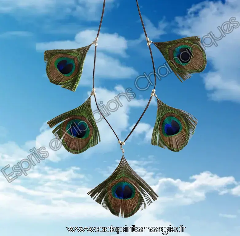 Orné de plumes de paon véritables, de perles en argent, cordon en cuir et d'attache en acier inoxydable